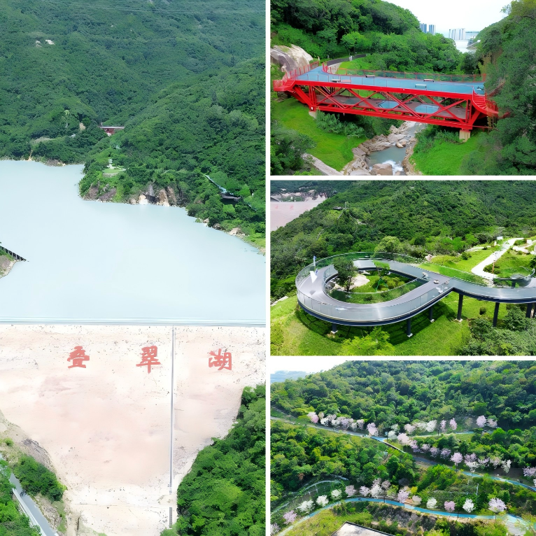 叠翠湖郊野公园旨在建设山海一体的活力北部山林景观,以叠翠湖为核心,主要施工内容包括公园树木砍伐、园林景观工程,含园建工程(如森林步道、登山道、观景平台、廊桥等)、绿化工程、景观水电安装工程等,通过建设森林步道、溪谷碧道、登山道、科普展示中心、廊桥、观景平台等,建成集新奇、活力、运动、休闲、科普为一体的郊野公园。